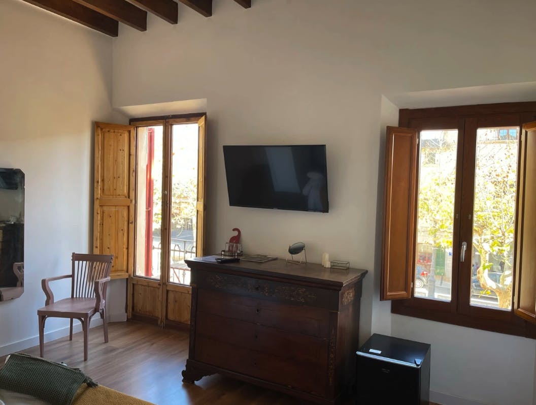 This double room with air conditioning includes a flat-screen TV with cable channels, a private bathroom, and a terrace with views of the mountains. The room is furnished with one bed.